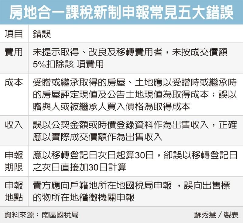 房地合一課稅新制去年上路以來,民眾仍時常發生申報錯誤,致遭補稅處罰。南區國稅局整理了五大申報常見錯誤,提醒民眾注意。