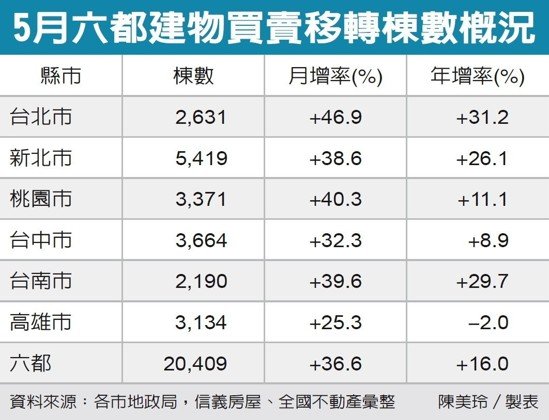 六都5月買賣移轉棟數較去年同期1萬7,588棟增加16%,更比4月1萬4,943棟大增36.6%;信義房屋不動產企研室專案經理曾敬德表示,5月移轉棟數大致可反應4月的旺季買氣,去年移轉結構也是4月減少,但5月反彈的情形,今年軌跡相似,但年增幅度相對去年更顯著,反應市場交易漸入佳境,今年買氣優於去年同期。